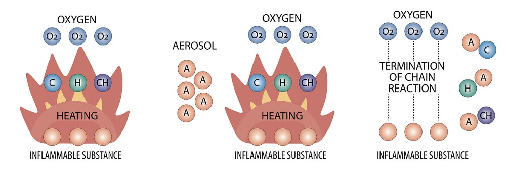 Aerosol yangın söndürücüler, yangını sürdüren kimyasal reaksiyon zincirini kırarak ve yangının devam etmesi için önemli olan hidrojen ve hidroksil molekülleri gibi serbest radikalleri emerek yangını kimyasal ve fiziksel olarak söndürür. Bu, serbest radikallerin aerosol partiküllerine bağlanarak yanma reaksiyonundan uzaklaştırılması yoluyla yapılır. Aerosol yangın söndürücüler, ortamdaki oksijen seviyesini önemli ölçüde azaltmaz ve bu nedenle insanların veya diğer canlıların bulunduğu alanlarda, onlar için risk oluşturmadan güvenle kullanılabilirler. Ek olarak, bu aerosol söndürücüler toksik değildir, bu da onları insanların bulunabileceği kapalı alanlarda kullanılmaya uygun hale getirir.